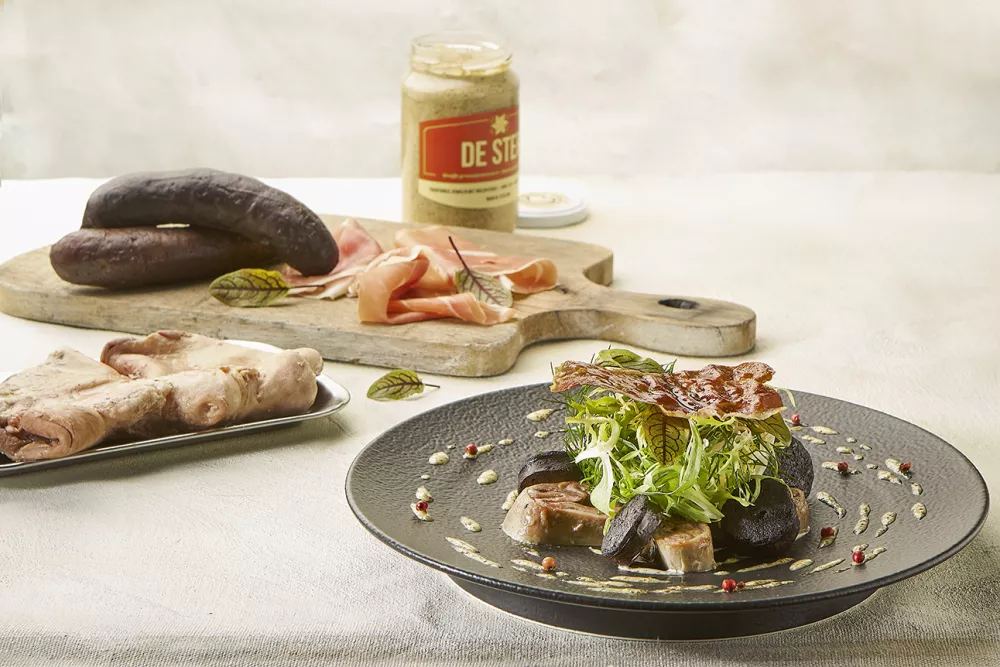 Chef Lieven Demeestere ging aan de slag met streekproducten. Een fris Vlaams charcuteriebord met West-Vlaamse zwienemutsen, zwarte pensen uit Midden-Brabant en Vlaamse gedroogde hesp.