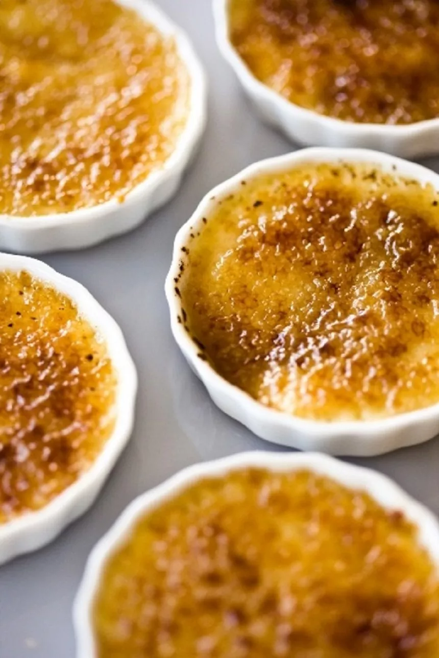 Bak in de voorverwarmde oven tot wanneer de buitenkant van de crème stevig is maar het midden nog wobbelig is. Haal de ramekins uit het water en laat afkoelen. Plaats in de ijskast tot net voor het serveren. Strooi een dun laagje ruw rietsuiker over elke crème. Karamelliseer de suiker met een gasbrander, laat even afkoelen en serveer.