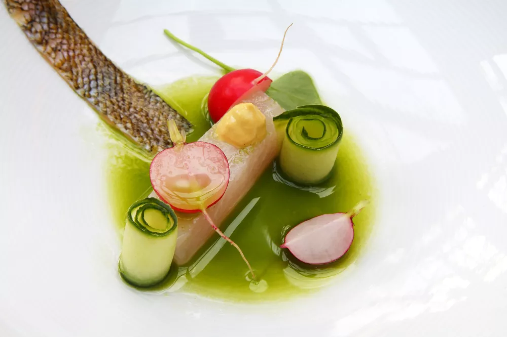 Snoekbaars, Belgische Elixir, komkommer, radijs en Leuvense mosterd.